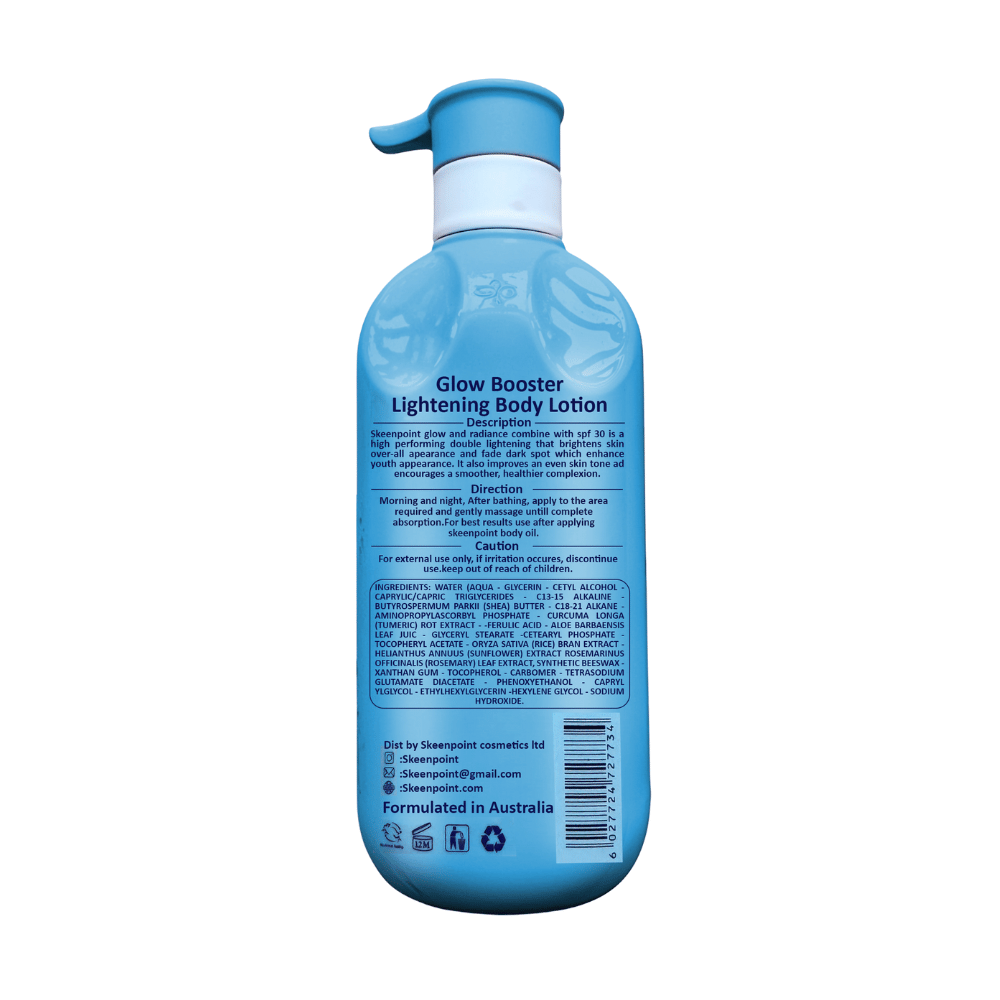 Glow Booster Lightening Body Lotion is Skeenpoint’s ultra-rich, brightening, and exfoliating formula designed to visibly reduce the appearance of age spots, melasma, and discoloration. Infused with Alpha Arbutin and Kojic Acid, this lotion helps regulate melanin production, diminish dullness, and promote a balanced, even skin tone.