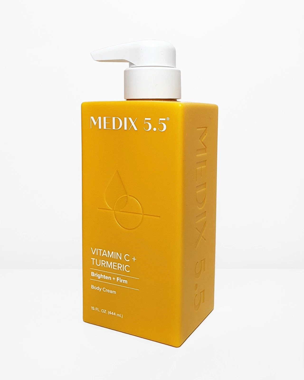 Medix 5.5 Vitamin C + Turmeric Body Cream is a brightening and firming body treatment designed to improve skin tone, radiance, and overall clarity. Formulated with two forms of Vitamin C, this antioxidant-rich cream helps visibly reduce dullness, uneven skin tone, and dark spots while supporting a smoother, more luminous complexion.